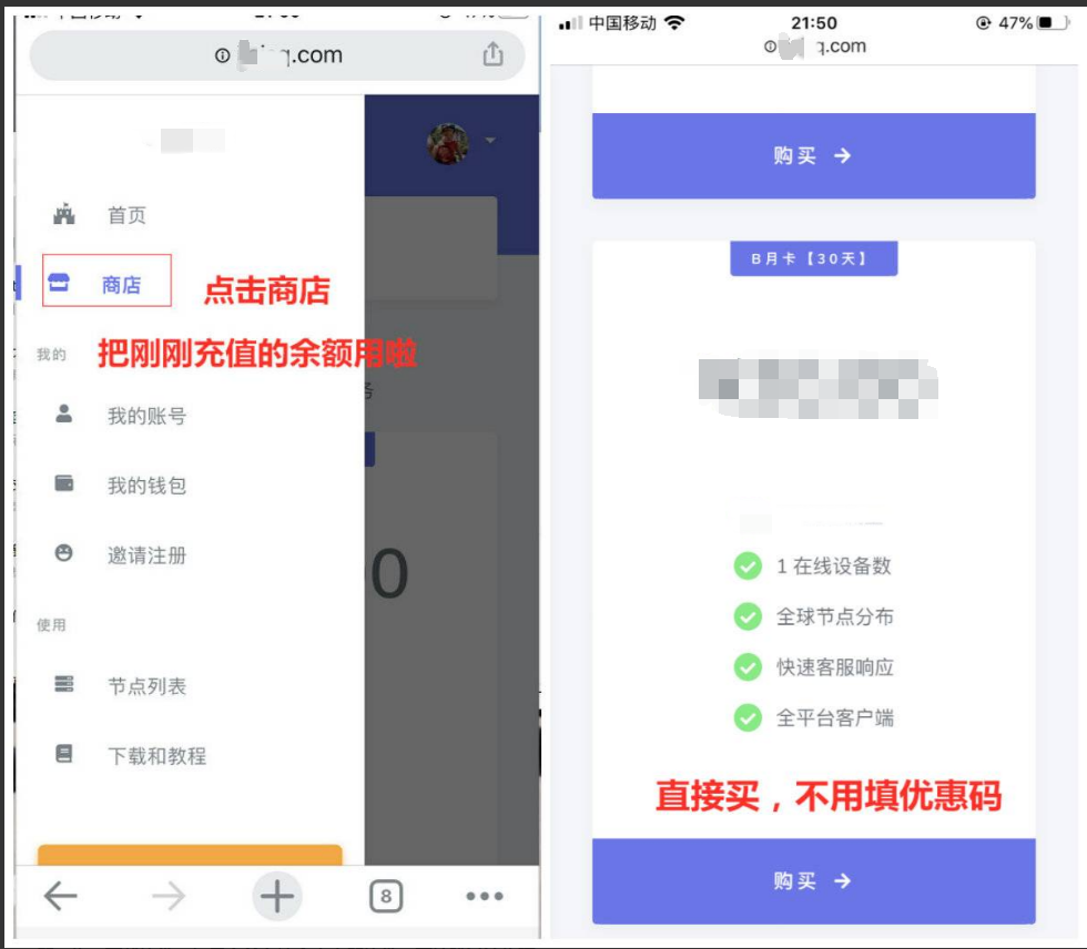 2.去商店购买套餐(把刚刚充值的金额用啦,不用您再掏钱啦,优惠码不用填直接下一步)